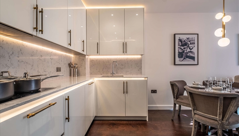 The apartment comprises a spacious reception room complete with Samsung Smart TV's with Bose sound bars incorporating a built in Amazon Alexa to control the reception room lighting, TV, heating systems and electric privacy curtains along with a private balcony. The reception room is open plan with a fully fitted kitchen featuring integrated Miele appliances and Hot Tap with floor to ceiling windows.